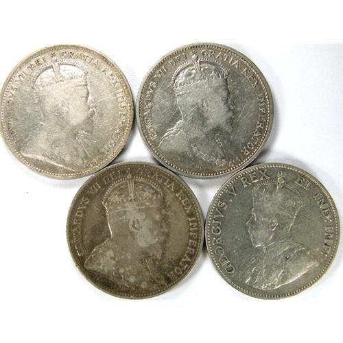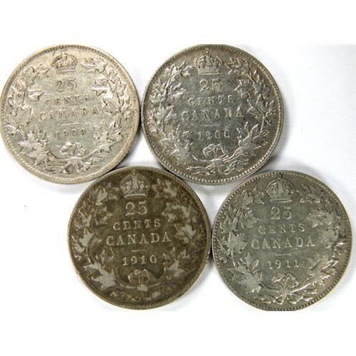 Canada Twenty-Five Cents 1903, 1906 Large Crown, 1910 and 1911, all F-VF and pale to light-medium toned