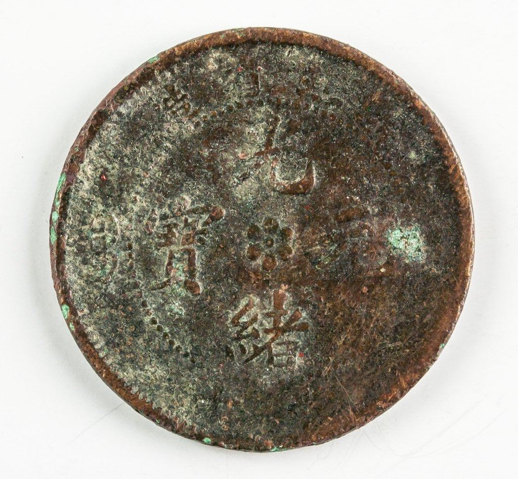 1903-1906 Chinese 10 Cash copper coin; Qing period; Zhejiang mint; obverse lettering Guang Xu Yuan Bao, Zheng Jiang Sheng Zao, Dang Shi; reverse engraved dragon; smooth edge; Y#49; sold at Heritage (2011) for $1,495; D: 28 mm, T: 1.2 mm, 7.324 grams
