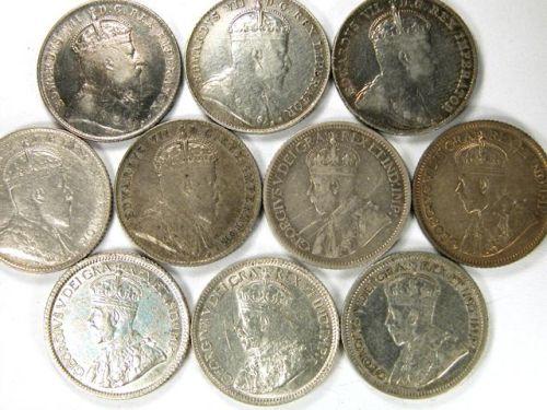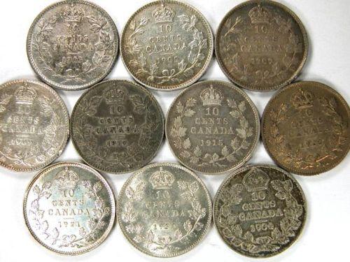 Canada Ten Cents 1903, 1905, 1909 Victorian Leaves, 1909 Broad Leaves, 1910, 1915, 1920, 1921, 1930 and 1934. Ten pieces, VF to AU, all scratched or cleaned