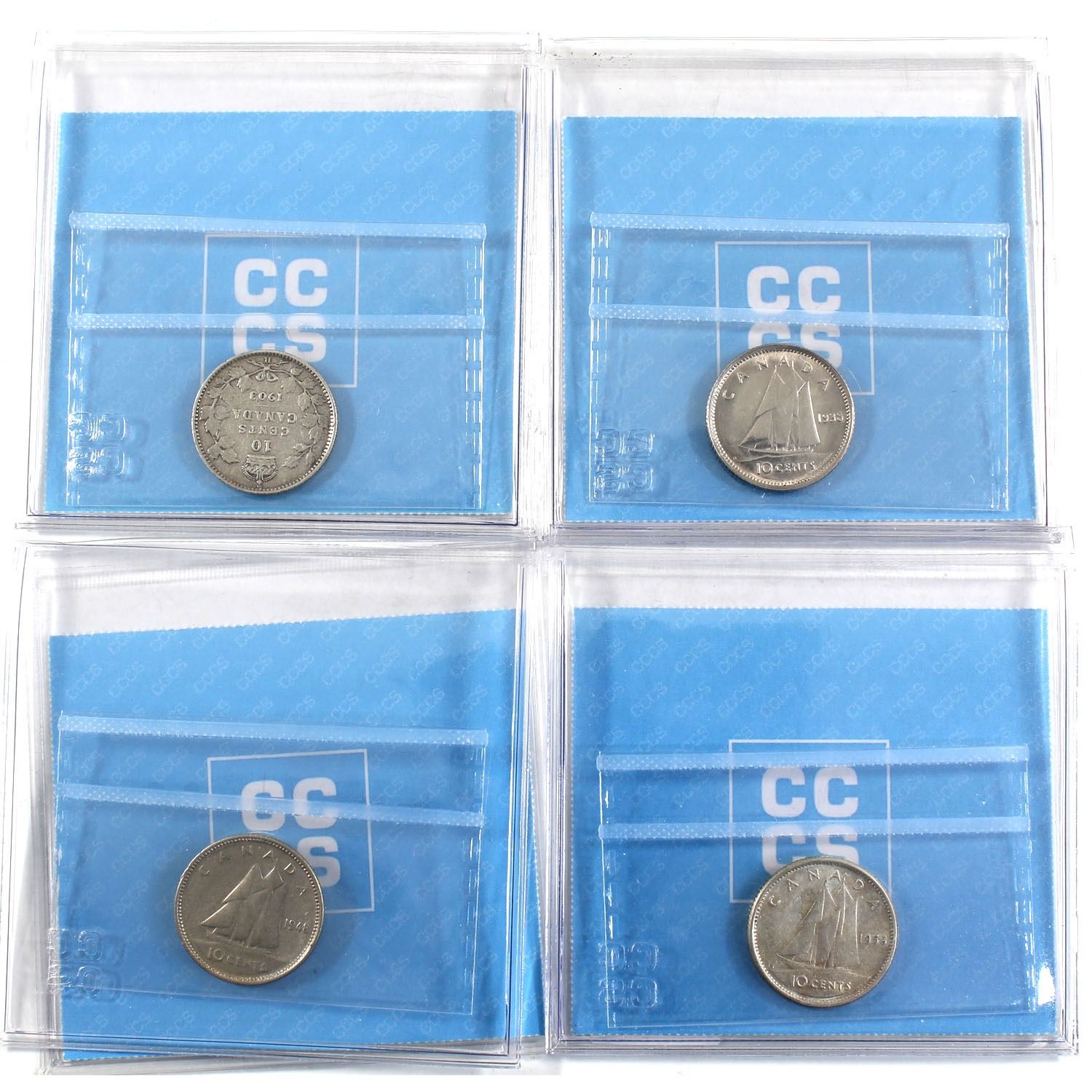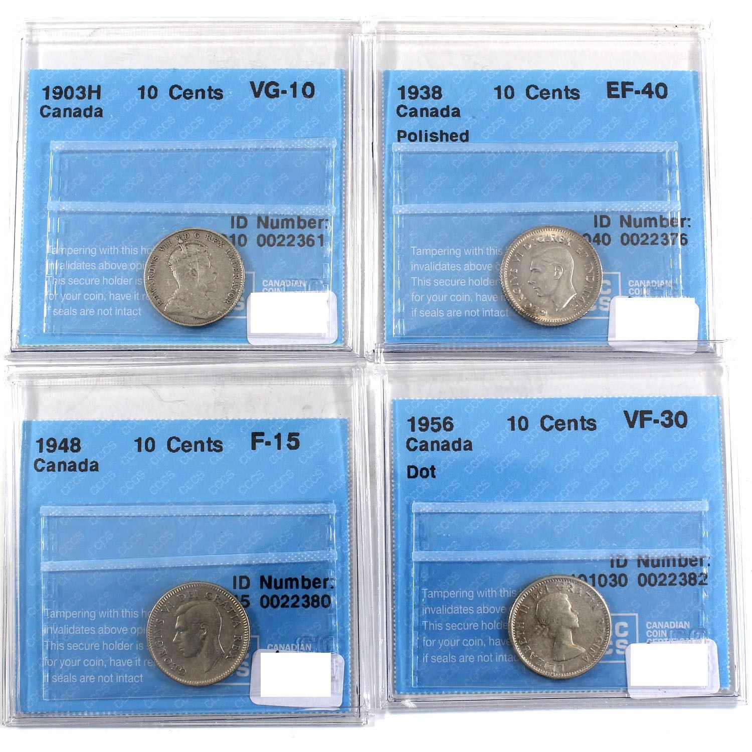 1903-1956 Canada 10-cent CCCS Certified - 1903H VG-10, 1938 EF-40 (Polished), 1948 F-15 & 1956 Dot VF-30. 4pcs