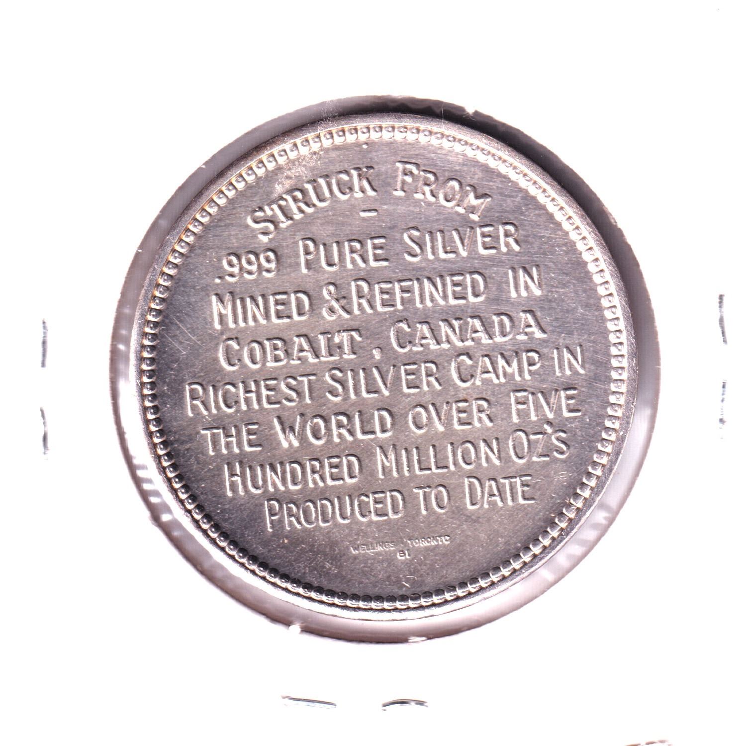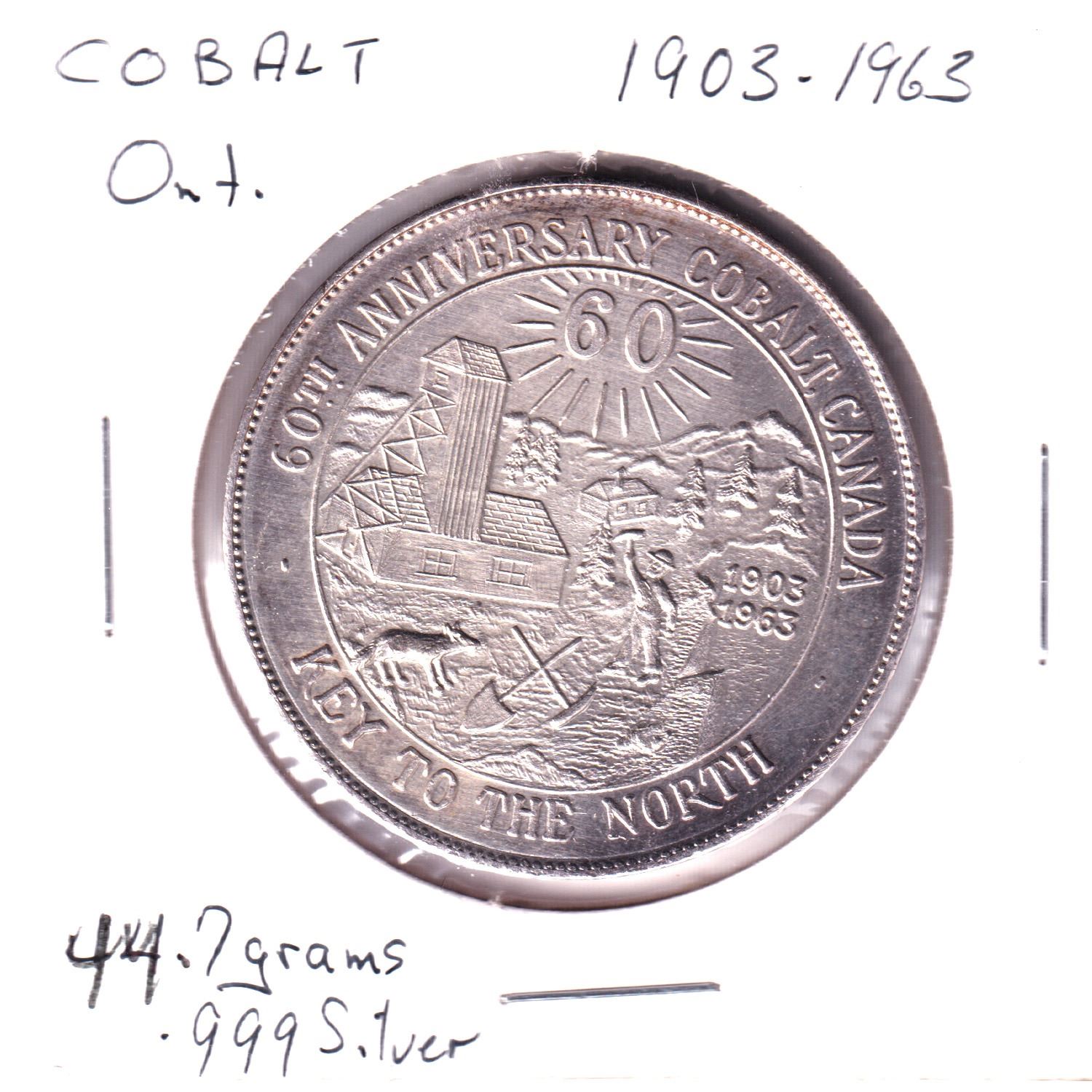 1903-1963 60th Anniversary Cobalt Ontario "Key to the North" commemorative round. Coin weighs 44.7g .999 Silver. (Tax exempt)