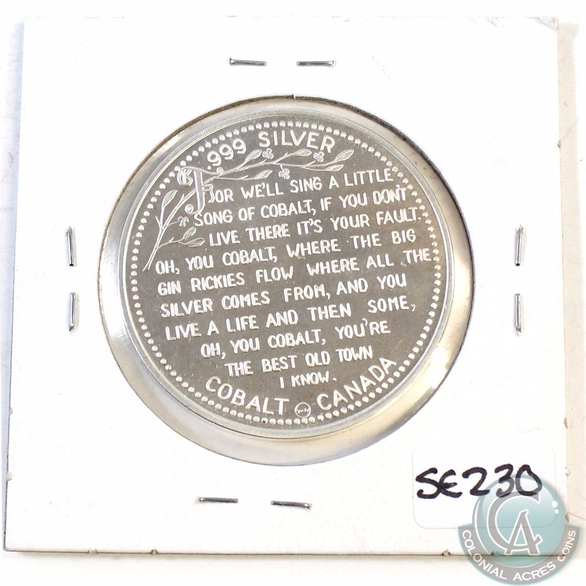 1903-1973 Cobalt Ontario, Canada .999 Fine Silver Commemorative Medallion. 38mm in diameter (Coin is toned). TAX Exempt