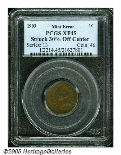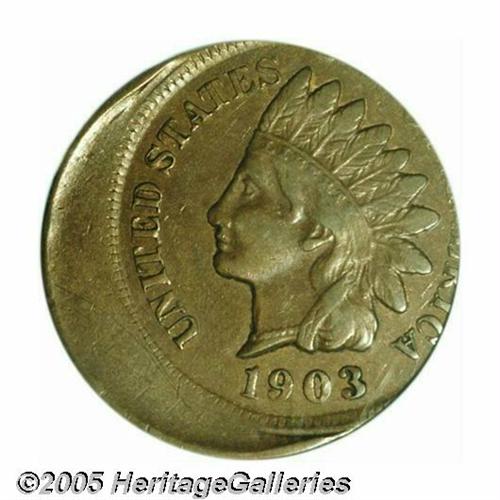 <B>1903<1C> Indian Cent--Struck 30% Off Center--XF45 PCGS.</B></I> The impression is skewed toward 2 o'clock. OF and the first few letters of AMERICA are missing, as is the lower right sliver of the wreath on the reverse.<BR><I>From The Larry Rausch Collection, Part Five.</B></I>