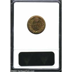 1903 1C MS62 Red and Brown ANACS. The colors are a blend of yellowish-green, orange, and purple-red.