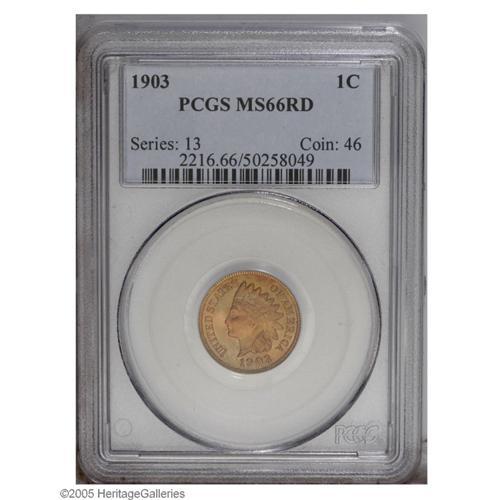 <B>1903<1C> MS66 Red PCGS.</B></I> Beautiful red-orange and mint-green colors alternate on the two sides of this shimmering Premium Gem. The striking details are typically soft on the feather tips, but are quite sharp elsewhere. Wonderfully preserved, the surfaces are blemish-free, save for a tiny, pinpoint-sized indentation, in the far upper obverse field. Population: 50 in 66 Red, 5 finer (9/05).