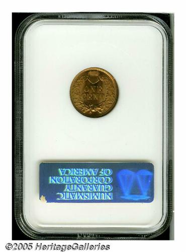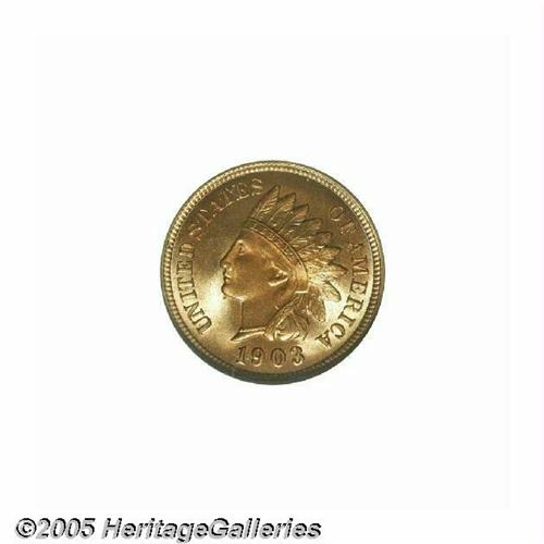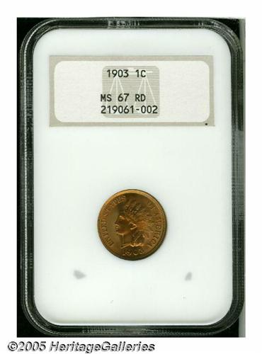 <B>1903<1C> MS67 Red NGC.</B></I> The otherwise orange-red obverse toning intermingles with steel-green color in the fields, and near the borders. The reverse coloration is a combination of lime-green and pastel pink-orange. Sharply struck, except on the upper three feather tips of the headdress, with gleaming, frosty luster, and immaculately preserved obverse and reverse surfaces. A couple of tiny spots reside on the lower obverse. A conditionally scarce Indian cent, with a rare degree of eye appeal. Population: 5 in 67 Red, 0 finer at either service (6/05).