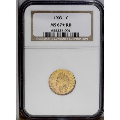 <B>1903<1C> MS67 <img border='0' src='http://www.heritagecoins.com/images/star.gif' width=10 height=10> Red NGC.</B></I> Superb color and overall surfaces with rich, original orange-red mint luster. Simply outstanding quality and a perfect coin for type purposes. Just a bit softly struck on the ends of the feathers of the Indian's headdress. Population: 5 in MS67 <img border='0' src='http://www.heritagecoins.com/images/star.gif' width=10 height=10>, none are finer (3/06). <BR><BR><B>Important notice:</B> Heritage usually auctions material at the rate of 200-250 lots per hour. On some occasions eBay Live bid software or the Internet may not be able to keep up with the pace of the auction. We recommend placing a realistic absentee bid now as insurance to avoid disappointment. Occasionally the auctioneer may eliminate or reject an eBay Live bid, and the auctioneer may also reopen a lot after the close of the eBay live bidding (usually because we missed an audience bid), and may reject your bid even if it shows you as the winning bidder. By bidding via eBay Live, you agree that Heritage may award the lot to another bidder at its sole discretion under the circumstances described above or any other reasonable circumstances. Since eBay bids are not shown to us until we open the lot on the floor, we treat those bids just like floor bids. In most cases the floor responds before the eBay bid is presented to us, due to Internet lag time, so for consistency we have made it a policy that floor bids are always considered first over tie eBay live bids. Also please note that all Heritage lots purchased through eBay Live carry a 20% Buyer's Premium. Please make sure you read the Terms and Conditions before you bid. This lot is being auctioned in conjunction with a live floor auction by Heritage Galleries & Auctioneers. All final auction and invoice information will be supplied by Heritage Galleries & Auctioneers, and all other information should be considered preliminary. Lot:419 <BR><BR><B>Winning Notification and Billing:</B> After the FINAL session in this auction is complete, Heritage will send e-mail and snail mail invoices. This process normally takes several days. All final auction and invoice information will be supplied by Heritage Galleries & Auctioneers, and all other information should be considered preliminary. <BR><BR>This auction will be conducted on a live auction floor and over the Internet through eBay Live. If you choose to place an absentee bid, please take a moment to <font color='#0000ff'><u><a href='http://pages.ebay.com/liveauctions/help/before/laabsentee.html'>learn how eBay Live absentee bidding works</a></u></font><font color='#000000'>