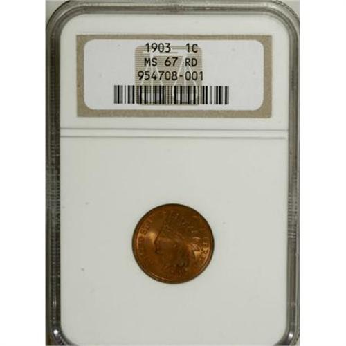 <B>1903 1C MS67 Red NGC.</B></I> This impeccable, frosty representative is a lustrous Superb Gem with blazing deep orange surfaces. It is sharply struck and presents exceptional aesthetic appeal. Despite a mintage of more than 85 million coins, and countless submissions of Mint State examples to the grading services, none have ever been certified finer than this coin. Census: 7 in 67 Red, 0 finer (6/07).<BR><I>From The Santa Fe Collection.</B></I><BR><BR><B>Coin Engraver:</B> James B. Longacre<BR><BR><b>Shipping:</b> Coins & Currency (<a target="_blank" href="http://www.heritageauctions.com/common/shipping.php">view shipping information</a>\)