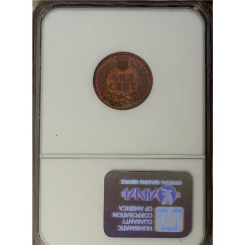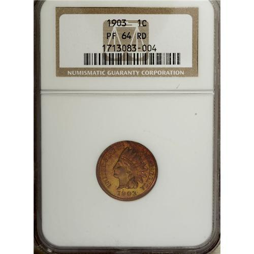 <B>1903 1C PR64 Red NGC.</B></I> The strike is a bit blunt on the highest feather tips, but color aficionados will adore this piece, with iridescent yellow-gold, lime-green, magenta, and scarlet hues in generous proportion on each side. The proof mintage was less than 1,800 pieces.<BR><BR><b>Shipping:</b> Coins & Currency (<a target="_blank" href="http://www.heritageauctions.com/common/shipping.php">view shipping information</a>)
