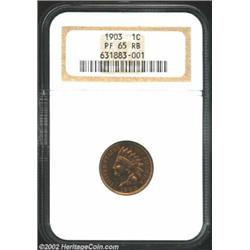 1903 1C PR65 Red and Brown NGC. Deeply reflective with subtle green-gold undertones and bright rose iridescence on the highpoints. A colorful survivor of this century-old proof Indian.From the Ohio Collection. Important notice: We expect to be auctioning lots at the rate of 200-250 per hour. Sometimes eBay Premier live bid software cannot keep up with that pace, so we strongly recommend that you place a realistic proxy bid now as insurance to avoid disappointment. Also please note that all Heritage/CAA lots purchased through eBay Premier carry a 20% Buyer's Premium. Please make sure you read the Terms and Conditions.