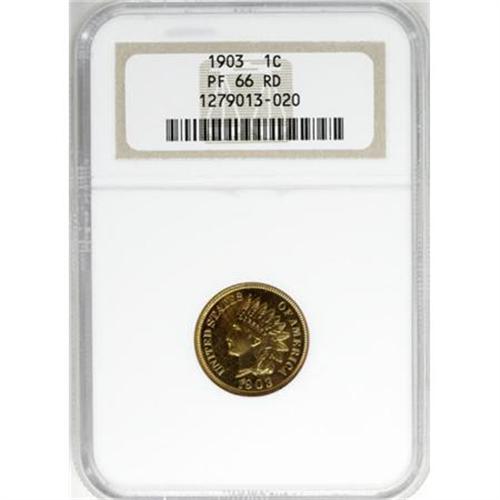 <B>1903 1C PR66 Red NGC.</B></I> An astonishing Premium Gem proof cent, whose Red designation obfuscates the incredible golden-green surfaces that cover both sides. There is good field-device contrast present as well, even though unrecognized on the encapsulation. Census: 17 in 66 Red, 3 finer (1/08).<BR><BR><B>Coin Engraver:</B> James B. Longacre<BR><BR><b>Shipping:</b> Coins & Currency (<a target="_blank" href="http://www.heritageauctions.com/common/shipping.php">view shipping information</a>)