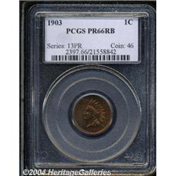 <B>1903<1C> PR66 Red and Brown PCGS.</B></I> Vivid ruby-red and lemon colors enliven this needle-sharp premium Gem. Seemingly unimprovable aside from a toning fleck below the R in AMERICA. Population: 2 in 66 Red and Brown, none finer (3/04). <BR><BR><B>Important notice:</B> Heritage usually auctions material at the rate of 200-250 lots per hour. On some occasions eBay Live bid software or the Internet may not be able to keep up with the pace of the auction. We recommend placing a realistic absentee bid now as insurance to avoid disappointment. Occasionally the auctioneer may eliminate or reject an eBay Live bid, and the auctioneer may also reopen a lot after the close of the eBay live bidding (usually because we missed an audience bid), and may reject your bid even if it shows you as the winning bidder. By bidding via eBay Live, you agree that Heritage may award the lot to another bidder at its sole discretion under the circumstances described above or any other reasonable circumstances. Since eBay bids are not shown to us until we open the lot on the floor, we treat those bids just like floor bids. In most cases the floor responds before the eBay bid is presented to us, due to Internet lag time, so for consistency we have made it a policy that floor bids are always considered first over tie eBay live bids. Also please note that all Heritage lots purchased through eBay Live carry a 20% Buyer's Premium. Please make sure you read the Terms and Conditions before you bid.