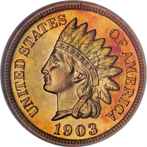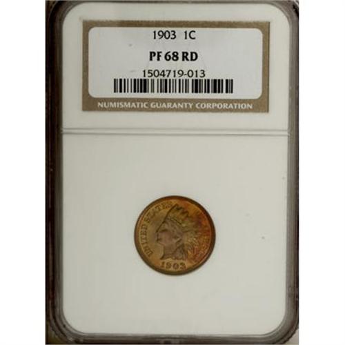 <B>1903 1C PR68 Red NGC.</B></I> A coin guaranteed to elicit instant oohs and aahs from delighted viewers. The pristine surfaces are yellow-green with a tinge of gold at the centers, ceding to areas of flaming cherry-red, sunset-orange, and fuchsia near the rims. As a bonus, the strike is essentially full, with no visible weakness. All four diamonds on the ribbon are bold, the feather tips are as sharp as ever seen on this design, and all of the vertical and horizontal shield lines are evident. Contact marks are entirely lacking, as expected for the grade. Even under a high-powered loupe, there are no distractions other than one or two flecks of the most trivial and inconsequential sort. This coin is a definite must for collectors of joyously toned Indian cents, a coin that will never disappoint. From the proof mintage of 1,790 pieces, there are none others the equal of this specimen, and none graded finer at either service (12/07).<BR><BR><B>Coin Engraver:</B> James B. Longacre<BR><BR><b>Shipping:</b> Coins & Currency (<a target="_blank" href="http://www.heritageauctions.com/common/shipping.php">view shipping information</a>)