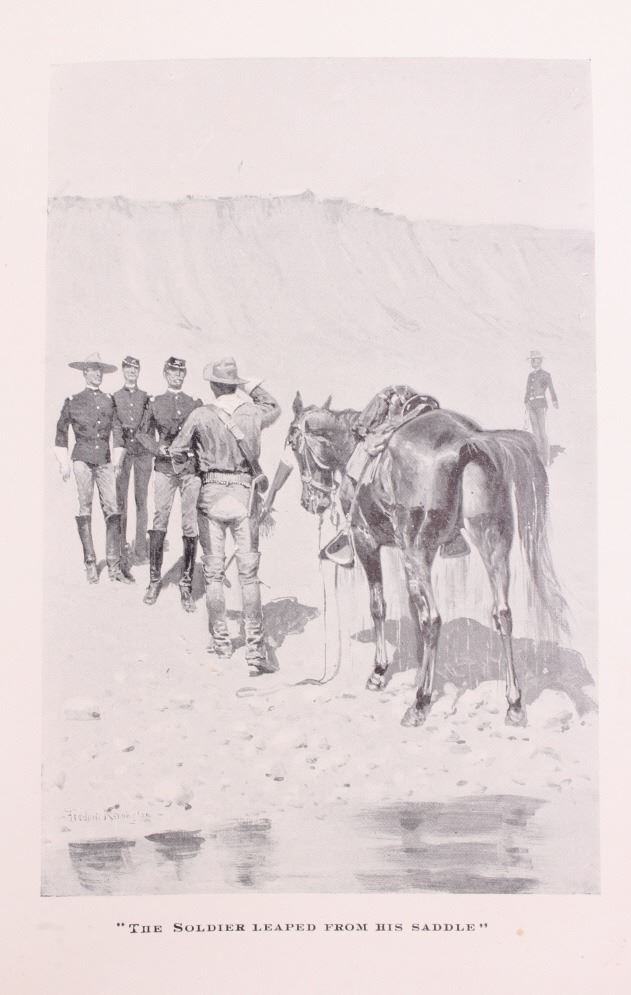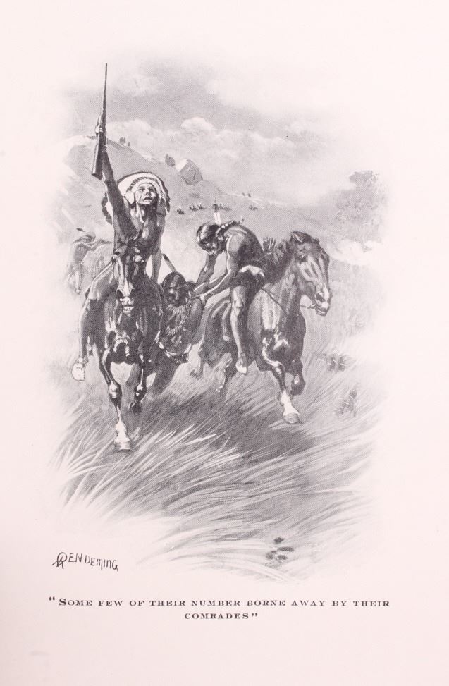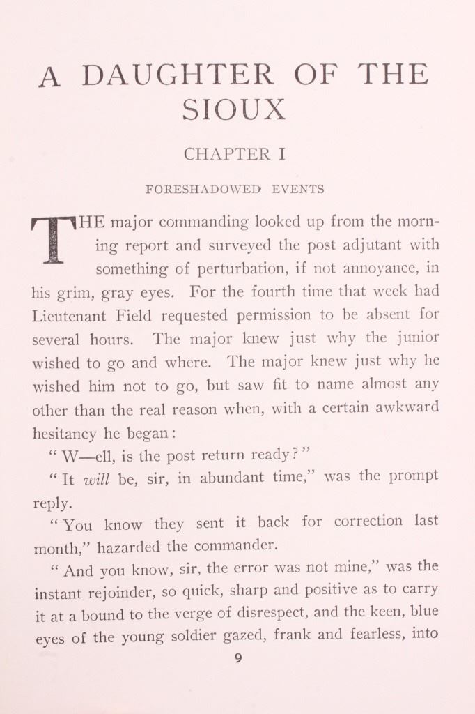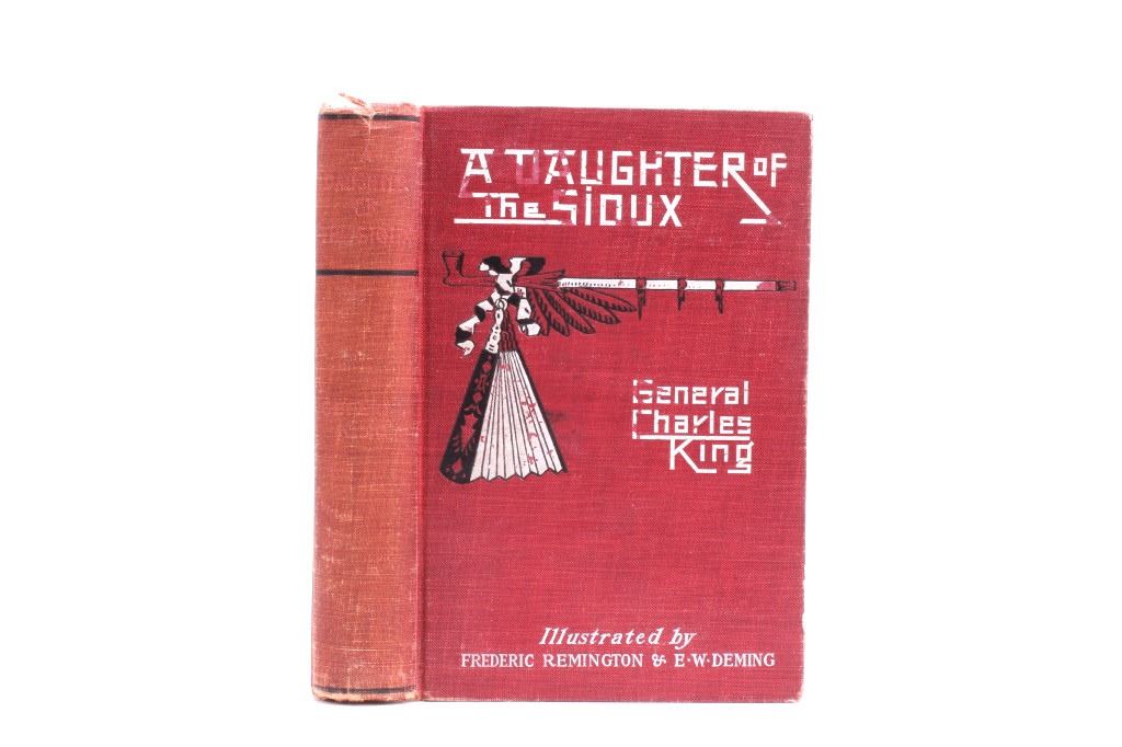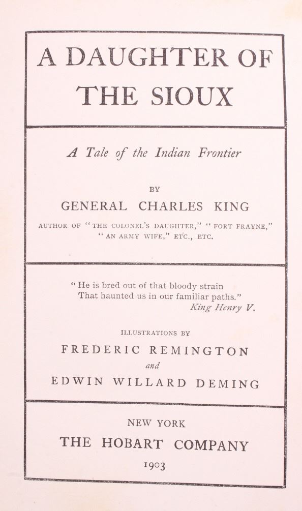For your consideration is this 1903 first edition copy of “A Daughter of the Sioux Gen. Charles King”, published in 1903 by The Hobart Company. It is illustrated by Frederick Remington and Edwin Willard Deming. "A Daughter of the Sioux" is a classic tale of the Old West and the demise of the Indian. The book was written by Gen. Charles King, a United States soldier and a distinguished writer. He graduated from West Point in 1866 and served in the Army during the Indian Wars under George Crook. He was wounded in the arm, forcing his retirement from the regular army. During this time, he became acquainted with Buffalo Bill Cody. King would later write scripts for several of Cody's silent films. He wrote and edited over 60 books and novels. The book's illustrations are by Frederic Remington and Edwin Willard Deming. This piece has the name of a previous owner written on the first page after the front cover. The condition of this book is good, with wear to the cover of the book and browning to the pages consistent with its age. The measurements of this book are 7 1/2" x 5 1/4".