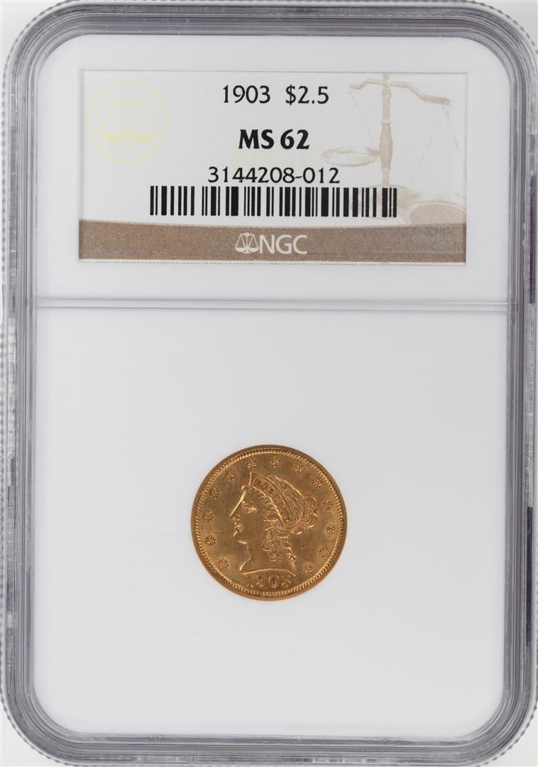 One 1903 $2 1/2 Liberty Head Quarter Eagle Gold Coin NGC MS62. NGC Certified.