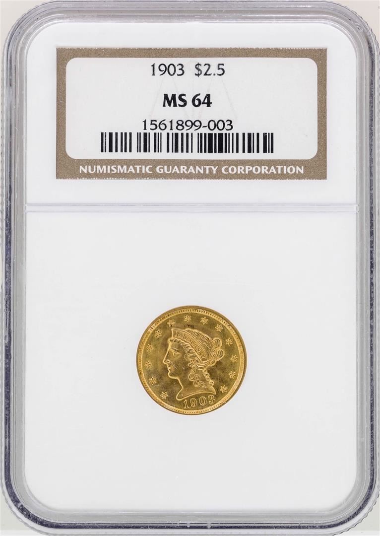 One 1903 $2 1/2 Liberty Head Quarter Eagle Gold Coin NGC MS64. NGC Certified.