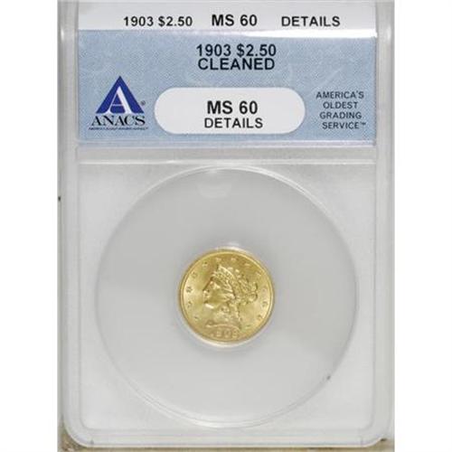 <B>1903 $2 1/2 --Cleaned--ANACS MS60 Details.</B></I> NGC Census: (52/4055). PCGS Population (83/4427). Mintage: 201,000. Numismedia Wsl. Price for NGC/PCGS coin in MS60: $240. (#7855)<BR><BR><B>Coin Engraver:</B> Christian Gobrecht<BR><BR><b>Shipping:</b> Coins & Currency (<a target="_blank" href="http://www.heritageauctions.com/common/shipping.php">view shipping information</a>)