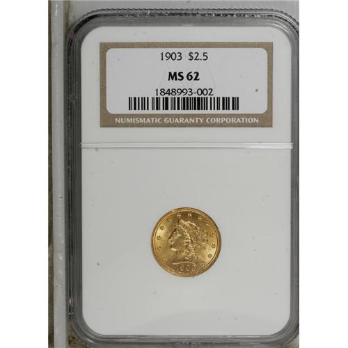 <B>1903 $2 1/2 MS62 NGC.</B></I> NGC Census: (882/2568). PCGS Population (925/3009). Mintage: 201,000. Numismedia Wsl. Price: $485. (#7855)<BR><BR><b>Shipping:</b> Coins & Currency (<a target="_blank" href="http://www.heritageauctions.com/common/shipping.php">view shipping information</a>)