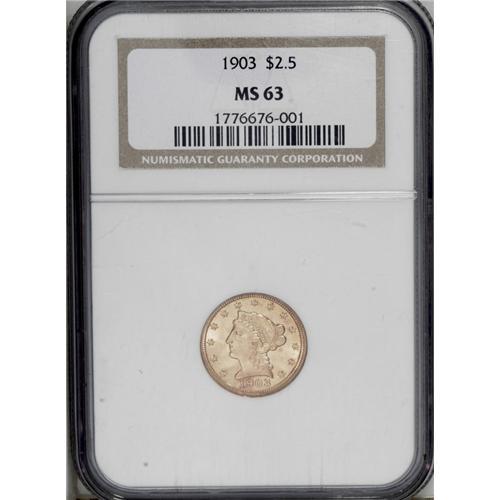 <B>1903<$2 1/2> MS63 NGC.</B></I> A well struck and lustrous example that has lovely orange-gold patina. A few minor alloy spots and slide marks do not impair the eye appeal.