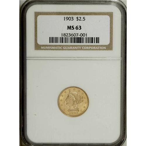 <B>1903 $2 1/2 MS63 NGC.</B></I> Select and well struck with strong, slightly reflective luster. Light abrasions appear in the fields, and a copper spot is noted on the reverse rim near the U in UNITED.<BR><BR><b>Shipping:</b> Coins & Currency (<a target="_blank" href="http://www.heritageauctions.com/common/shipping.php">view shipping information</a>)