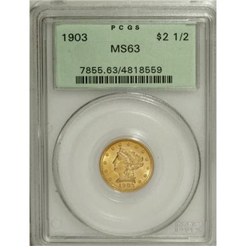 <B>1903 $2 1/2 MS63 PCGS.</B></I> PCGS Population (1324/1689). NGC Census: (943/1680). Mintage: 201,000. Numismedia Wsl. Price for NGC/PCGS coin in MS63: $730. (#7855)<BR><BR><B>Coin Engraver:</B> Christian Gobrecht<BR><BR><b>Shipping:</b> Coins & Currency (<a target="_blank" href="http://www.heritageauctions.com/common/shipping.php">view shipping information</a>\)
