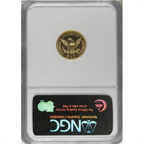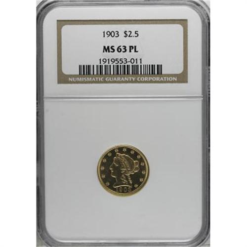 <B>1903 $2 1/2 MS63 Prooflike NGC.</B></I> Exquisitely struck design elements display pleasing contrast with Prooflike fields on this Select quarter eagle. A few wispy handling marks visible under high magnification define the grade. Difficult to obtain in Prooflike condition. Census: 2 in 63 Prooflike, 2 finer (7/07).<BR><BR><B>Coin Engraver:</B> Christian Gobrecht<BR><BR><b>Shipping:</b> Coins & Currency (<a target="_blank" href="http://www.heritageauctions.com/common/shipping.php">view shipping information</a>)