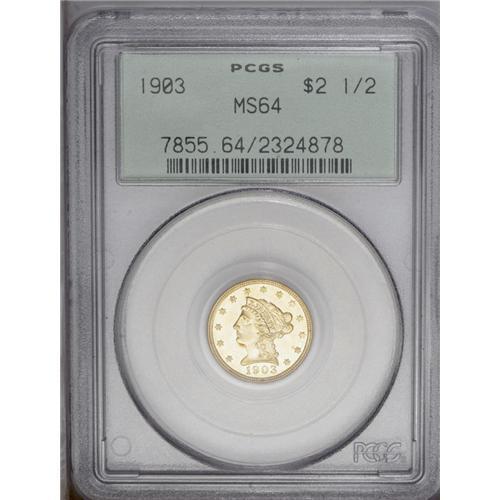 <B>1903<$2 1/2> MS64 PCGS.</B></I> A beautiful near-Gem whose only fault is a few tiny copper-gold alloy spots. The major devices are intricately delivered by the dies. Housed in an older green label holder.