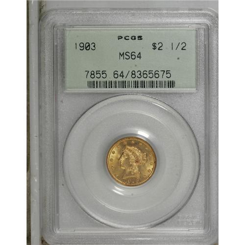 <B>1903 $2 1/2 MS64 PCGS.</B></I> A gorgeous canary-gold type coin with an exacting strike and a refreshingly unabraded appearance. Three small cherry-red alloy spots are detected. Certified in an old green label holder.<BR><BR><b>Shipping:</b> Coins & Currency (<a target="_blank" href="http://www.heritageauctions.com/common/shipping.php">view shipping information</a>)