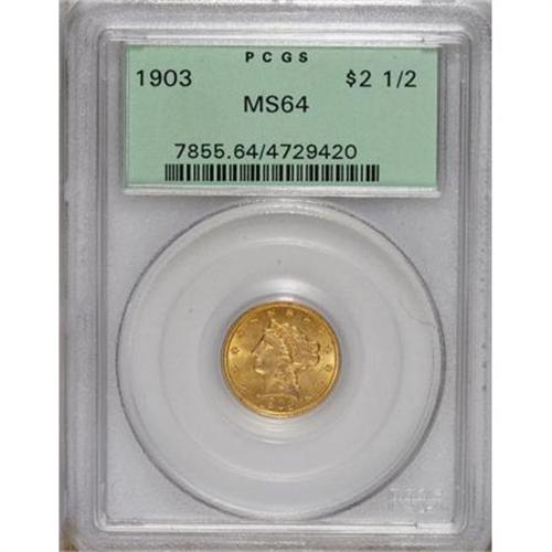 <B>1903 $2 1/2 MS64 PCGS.</B></I> This expertly struck and lustrous almond-gold near-Gem is impeccably preserved, and encased in a green label holder.<BR><BR><b>Shipping:</b> Coins & Currency (<a target="_blank" href="http://www.heritageauctions.com/common/shipping.php">view shipping information</a>)