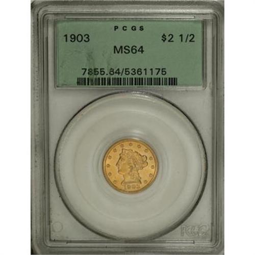 <B>1903 $2 1/2 MS64 PCGS.</B></I> . PCGS Population (1051/735). NGC Census: (997/777). Mintage: 201,000. Numismedia Wsl. Price for NGC/PCGS coin in MS64: $1,360. (#7855)<BR><BR><B>Coin Engraver:</B> Christian Gobrecht<BR><BR><b>Shipping:</b> Coins & Currency (<a target="_blank" href="http://www.heritageauctions.com/common/shipping.php">view shipping information</a>)