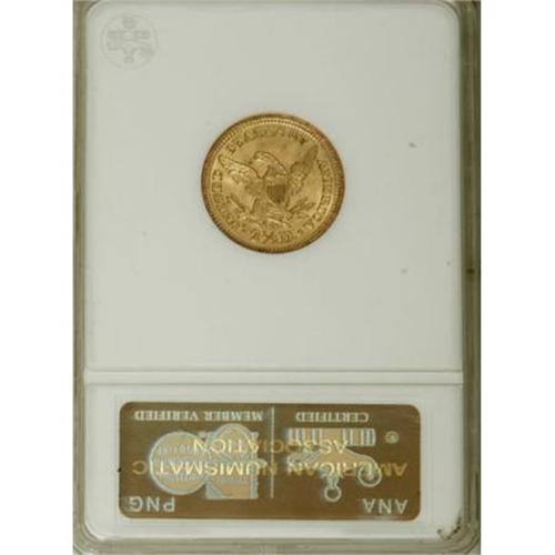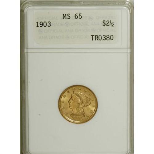 <B>1903 $2 1/2 MS65 ANACS.</B></I> Struck with pinpoint sharpness and exhibiting a vibrant, satiny glow that is virtually unimpeded by evidence of contact. Only under close scrutiny are a few trivial disturbances noted on Liberty's brow and chin. Housed in an early generation ANACS holder.<BR><BR><B>Coin Engraver:</B> Christian Gobrecht<BR><BR><b>Shipping:</b> Coins & Currency (<a target="_blank" href="http://www.heritageauctions.com/common/shipping.php">view shipping information</a>\)