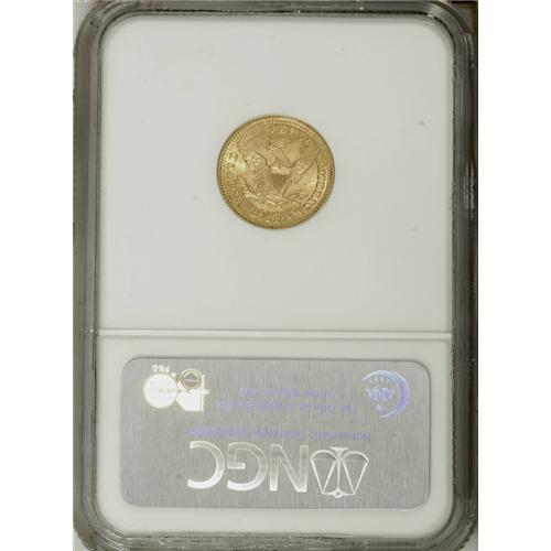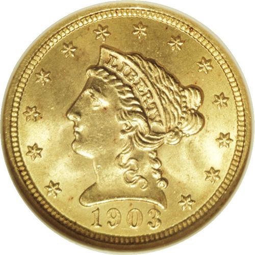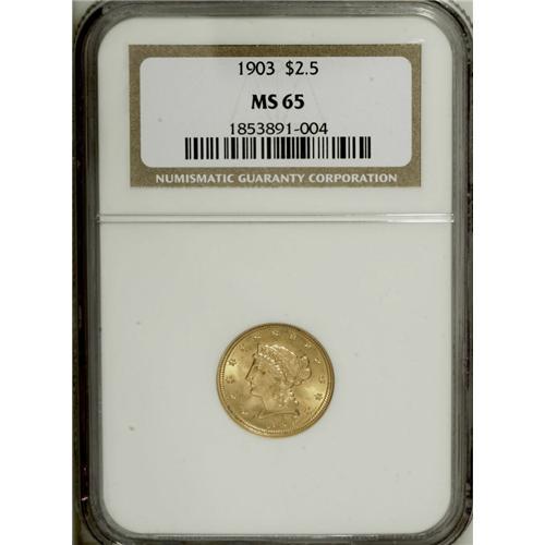 <B>1903 $2 1/2 MS65 NGC.</B></I> This is an exceptional Gem specimen with deep honey-gold luster and sharply struck design details on both sides. A few tiny copper toning spots are evident on the obverse and reverse. The 1903 quarter eagle is considered to be a common-date issue, from a mintage of 201,000 coins, with numerous Gem examples available to date and type collectors.<BR><BR><b>Shipping:</b> Coins & Currency (<a target="_blank" href="http://www.heritageauctions.com/common/shipping.php">view shipping information</a>)