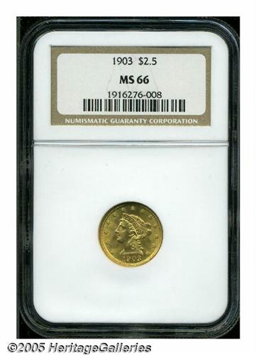 <B>1903<$2 1/2> MS66 NGC.</B></I> An exquisitely struck Premium Gem with impressive luster and gorgeous peach-gold surfaces that reveal subtle greenish undertones. A couple of trivial marks on Liberty's cheek are mentioned for accuracy. Although not a rare issue in lower Mint State grades, this lovely quarter eagle would make a splendid addition to the highest quality gold type set. NGC has seen only 47 coins grading higher, and PCGS has certified 45 pieces finer (5/05).