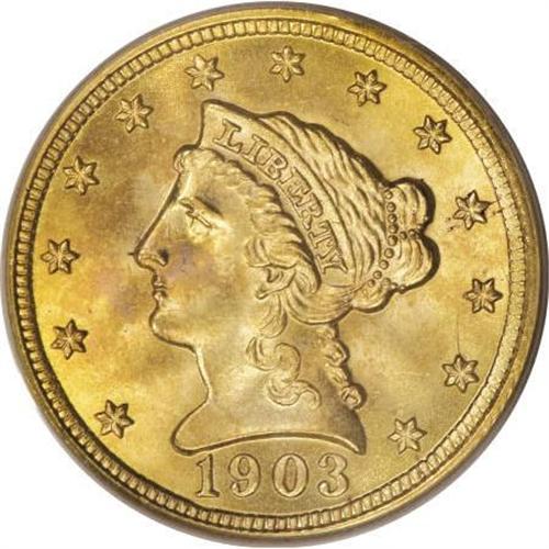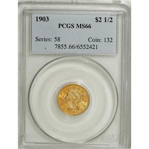 <B>1903 $2 1/2 MS66 PCGS.</B></I> A splendid Premium Gem example of this popular type. Satiny and highly lustrous, the surfaces are decorated with deep orange-gold and lilac toning. The striking details are crisp and complete on both sides. <BR>A near-flawless quarter eagle from the early years of the past century. <BR><I>From The Nick-A-Jack Collection.</B></I><BR><BR><B>Coin Engraver:</B> Christian Gobrecht<BR><BR><b>Shipping:</b> Coins & Currency (<a target="_blank" href="http://www.heritageauctions.com/common/shipping.php">view shipping information</a>)