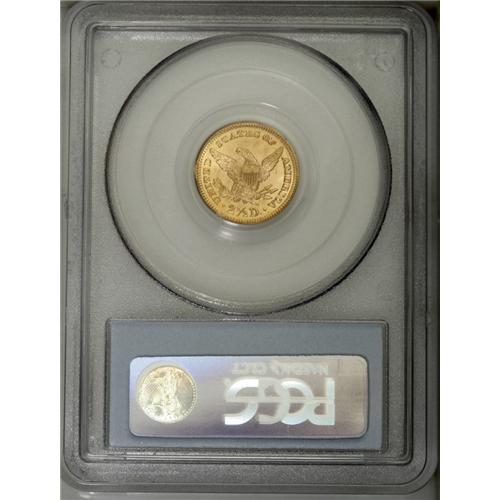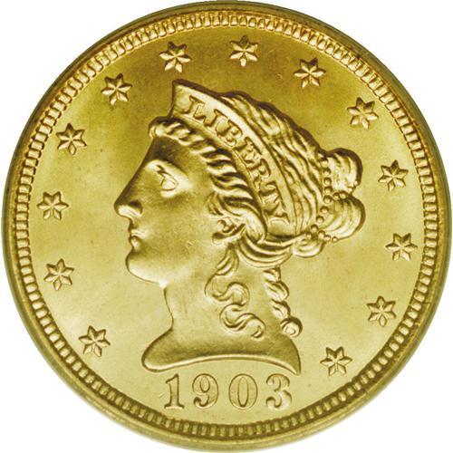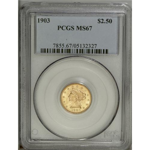 <B>1903 $2 1/2 MS67 PCGS.</B></I> This shimmering piece advertises its splendid quality upon first glance. The sharp strike, beautiful yellow-gold toning, and effulgent mint frost are instantly apparent. Close inspection with a magnifier takes a little longer, but confirms the exemplary overall quality of the coin. A hair-thin line above the eagle's beak is mint-made, and interesting faint die lines can be seen beneath the letters of LIBERTY. A tiny nick just to the left of the date is the only post-striking blemish. Population: 46 in 67, 0 finer (10/06).<BR><BR><b>Shipping:</b> Coin/Currency (<a target="_blank" href="http://www.heritageauctions.com/common/shipping.php">view shipping information</a>)