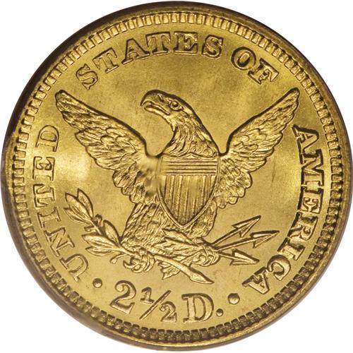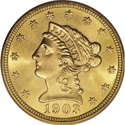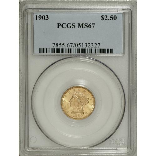 <B>1903 $2 1/2 MS67 PCGS.</B></I> This shimmering piece advertises its splendid quality upon first glance. The sharp strike, beautiful yellow-gold toning, and effulgent mint frost are instantly apparent. Close inspection with a magnifier takes a little longer, but confirms the exemplary overall quality of the coin. Population: 46 in 67, 0 finer (2/07).<BR><BR><b>Shipping:</b> Coins & Currency (<a target="_blank" href="http://www.heritageauctions.com/common/shipping.php">view shipping information</a>)