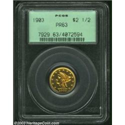 <TABLE cellSpacing=0 cellPadding=0 width="100%" bgColor=#000000 border=0><TBODY><TR><TD width="100%"><TABLE cellSpacing=1 cellPadding=3 width="100%" border=0><TBODY><TR><TD width="100%" bgColor=#79735c><FONT face=arial color=#ffffff size=3><B>Description</B> </FONT></TD></TR><TR><TD width="100%" bgColor=#ffffff><FONT face=arial size=2><B>1903 $2 1/2 PR63 PCGS.</B></I> Both sides exhibit deep, watery reflectivity and pinpoint definition, with tinges of olive patina at the borders. The mintage of 197 pieces is actually among the higher production figures for the series, an indication of just how scarce these proof issues really are. </FONT></TD></TR></TBODY></TABLE></TD></TR></TBODY></TABLE><BR><A name=PricesRealized></A><TABLE cellSpacing=0 cellPadding=0 width="100%" bgColor=#000000 border=0><TBODY><TR><TD width="100%"><TABLE cellSpacing=1 cellPadding=3 width="100%" border=0><TBODY><TR><TD width="100%" bgColor=#79735c><A name=PR><FONT face=arial color=#ffffff size=3><B>Previous Prices from Heritage Auctions</B> </FONT></A></TD></TR><TR><TD bgColor=#f6f6ed><TABLE cellSpacing=0 cellPadding=0 width="100%" border=1><TBODY><TR><TD align=middle width="33%"><B>Date</B></TD><TD align=middle width="33%"><B>Service</B></TD><TD align=middle width="33%"><B>Price</B></TD></TR><TR bgColor=whitesmoke><TD width="33%"><B>01/01/2000</B></TD><TD width="33%">PCGS</TD><TD width="33%">$3,910.00</TD></TR><TR bgColor=whitesmoke><TD width="33%"><B>05/01/1998</B></TD><TD width="33%">PCGS</TD><TD width="33%">$6,050.00</TD></TR><TR bgColor=whitesmoke><TD width="33%"><B>11/01/1993</B></TD><TD width="33%">PCGS</TD><TD width="33%">$4,400.00</TD></TR></TBODY></TABLE></TD></TR><TR><TD bgColor=#ffffff><FONT face=arial size=1 ?>PLEASE NOTE: All prices realized reflect the final hammer price PLUS the buyer's premium in auctions that charge a buyer's premium. Each item has a notation at the top of the listing indicating whether that lot included a buyer's premium. Example: A item that sells with a final hammer price of $100 and a 20% buyer's premium will display with a price realized of $120. All information listed is intended to be as accurate as possible, but errors are possible. Please use this guide carefully and inform us of any inaccuracies. </FONT></TD></TR></TBODY></TABLE></TD></TR></TBODY></TABLE><BR><TABLE cellSpacing=0 cellPadding=0 width="100%" bgColor=#000000 border=0><TBODY><TR><TD width="100%"><TABLE cellSpacing=1 cellPadding=3 width="100%" border=0><TBODY><TR><TD width="100%" bgColor=#79735c colSpan=6><FONT face=arial color=#ffffff size=3><B>Price Guide*</B> </FONT></TD></TR><TR bgColor=#f6f6ed><TD align=middle><B>Grade</B> </TD><TD align=middle><B>Coin World<BR>(Trends)</B> </TD><TD align=middle><B>Numismedia<BR>Retail</B> </TD><TD align=middle><B>Numismedia<BR>Wholesale</B> </TD><TD align=middle><B>Coin<BR>Universe</B> </TD><TD align=middle><B>Heritage<BR>Value Index</B> </TD></TR><TR bgColor=#ffffff><TD align=middle>62</TD><TD align=right>---</TD><TD align=right>---</TD><TD align=right>$2,975.00</TD><TD align=right>$3,250.00</TD><TD align=right>$2,690.00</TD></TR><TR style="FONT-WEIGHT: bold" bgColor=#cccfdd><TD align=middle>63</TD><TD align=right>---</TD><TD align=right>---</TD><TD align=right>$4,100.00</TD><TD align=right>$5,250.00</TD><TD align=right>$3,651.67</TD></TR><TR bgColor=#ffffff><TD align=middle>64</TD><TD align=right>---</TD><TD align=right>---</TD><TD align=right>$6,125.00</TD><TD align=right>$8,000.00</TD><TD align=right>$5,262.00</TD></TR><TR bgColor=#ffffff><TD colSpan=6><FONT size=1>*All information listed is intended to be as accurate as possible, but errors are possible. No item may be returned or refused based on this information which is provided as a service to our customers. You should contact each pricing source directly to determine the accuracy of this information. </FONT></TD></TR></TBODY></TABLE></TD></TR></TBODY></TABLE><BR><TABLE cellSpacing=0 cellPadding=0 width="100%" bgColor=#000000 border=0><TBODY><TR><TD width="100%"><TABLE cellSpacing=1 cellPadding=3 width="100%" border=0><TBODY><TR><TD width="100%" bgColor=#79735c><FONT face=arial color=#ffffff size=3><B>Population Guide</B> </FONT></TD></TR><TR bgColor=#ffffff><TD align=middle><!-- Begin Output of Population Grid--><TABLE cellSpacing=0 cellPadding=0 width="100%" border=0><TBODY><TR><TD vAlign=center><TABLE cellSpacing=0 width="100%" border=1 cellsadding="3"><TBODY><TR><TD vAlign=center><TABLE cellSpacing=0 cellPadding=3 width="100%" border=1><TBODY><TR><TD vAlign=center align=middle bgColor=#f0f1e8 colSpan=2 <CENTER><FONT face=Arial size=2><B>PCGS Pop </B></FONT><CENTER></CENTER></TD><TD vAlign=center align=middle bgColor=#f0f1e8 colSpan=2><CENTER><FONT face=Arial size=2><B>NGC Pop</B></CENTER></FONT></TD></TR><TR><TD vAlign=center><FONT face=Arial size=2>(63)</FONT> </TD><TD vAlign=center align=right><FONT face=Arial size=2>22</FONT> </TD><TD vAlign=center><FONT face=Arial size=2>(63)</FONT> </TD><TD vAlign=center align=right><FONT face=Arial size=2>7</FONT> </TD></TR><TR><TD vAlign=center><FONT face=Arial size=2>(>63)</FONT> </TD><TD vAlign=center align=right><FONT face=Arial size=2>63</FONT> </TD><TD vAlign=center><FONT face=Arial size=2>(>63)</FONT> </TD><TD vAlign=center align=right><FONT face=Arial size=2>44</FONT> </TD></TR></TBODY></TABLE></TD></TR></TBODY></TABLE></TD></TR></TBODY></TABLE><!-- End Output of Population Grid--> Important notice: Heritage usually auctions material at the rate of 200-250 lots per hour. On some occasions eBay Live bid software or the Internet may not be able to keep up with the pace of the auction. We recommend placing a realistic absentee bid now as insurance to avoid disappointment. Occasionally the auctioneer may eliminate or reject an eBay Live bid, and the auctioneer may also reopen a lot after the close of the eBay live bidding (usually because we missed an audience bid), and may reject your bid even if it shows you as the winning bidder. By bidding via eBay Live, you agree