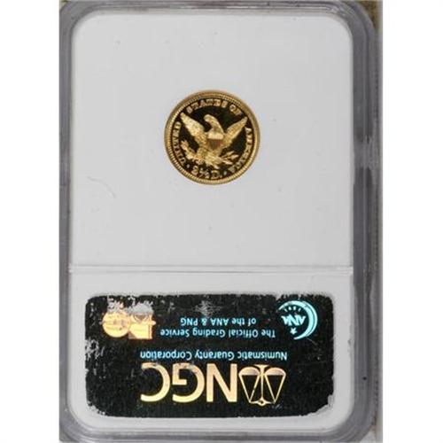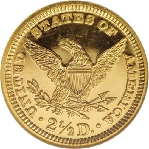 <B>1903 $2 1/2 PR65 Cameo NGC.</B></I> The reverse exhibits unimprovable cameo contrast, and the stars, the date, and Liberty's hair are also frosty. Extended rotation of this mirrored Gem beneath a light and loupe cannot find any remotely mentionable hairlines. Although business strike Liberty quarter eagles from this era are also well struck, proofs are readily distinguished by the reflectivity of their fields and the squared edges of the denticles. On business strikes, the edges of the denticles tend to slope toward the field.<BR>For the 1903, 197 proofs were struck, but fewer than that number has survived unimpaired. NGC has certified 88 pieces in all grades, but almost certainly, a portion of that figure reflects resubmissions over the past 20 years. Census: 4 in 65 Cameo, none finer with a Cameo designation (9/07).<BR><BR><b>Shipping:</b> Coins & Currency (<a target="_blank" href="http://www.heritageauctions.com/common/shipping.php">view shipping information</a>)