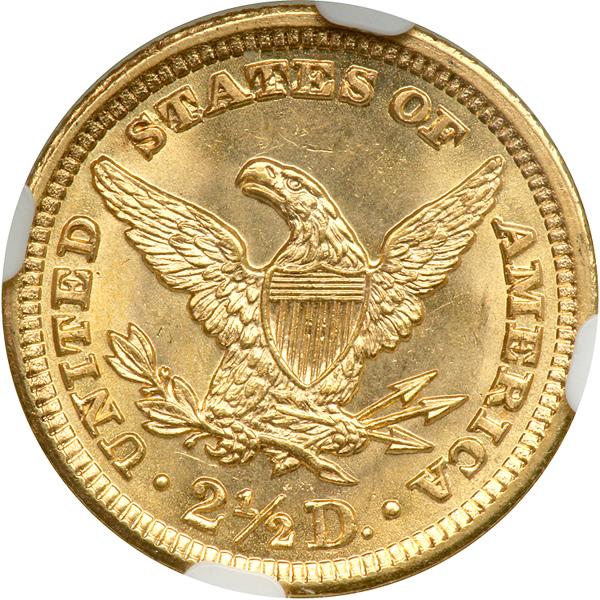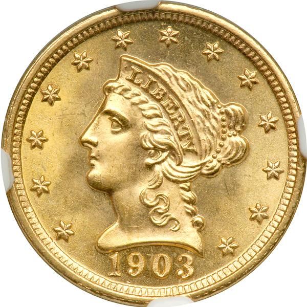 1903 $2.50 Liberty. NGC graded MS-66. Boldly struck and predominantly untoned. When compared to other issues in the long-lived Liberty Quarter Eagle series, dates after 1900 are common. Still, the original business strike mintage is a not overly generous in most years, and survivors are seldom encountered above the Gem grade level. Pop 278; 88 finer, 2 in 66 Star, 78 in 67, 5 in 67 Star, and 3 in 68 (PCGS # 7855) .