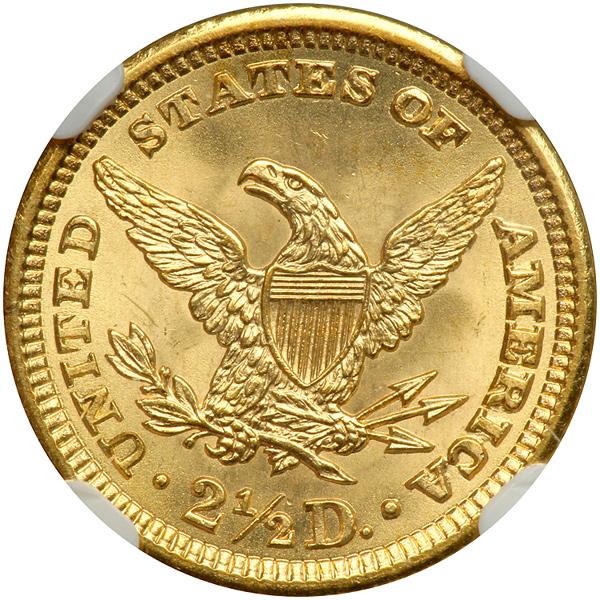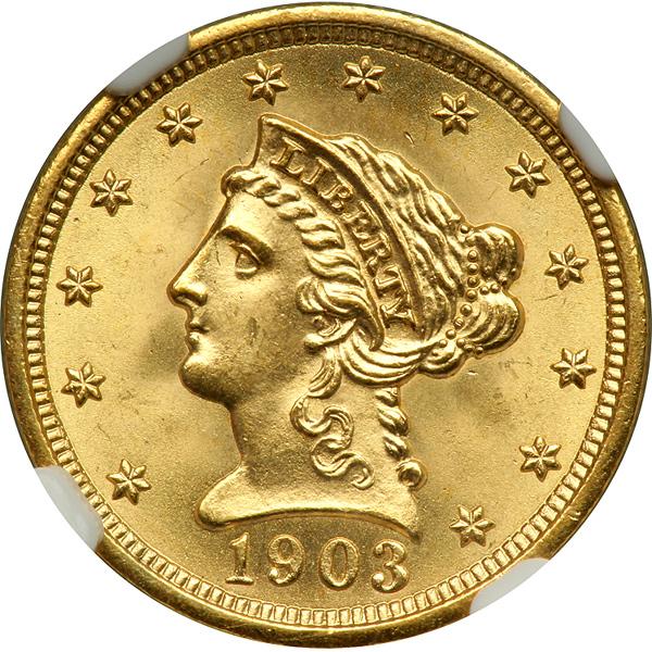 1903 $2.50 Liberty. NGC graded MS-66. Well struck, frosty and untoned. Pop 278; 88 finer, 2 in 66 Star, 78 in 67, 5 in 67 Star, and 3 in 68 (PCGS # 7855) .
