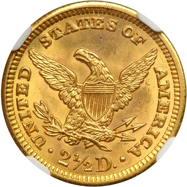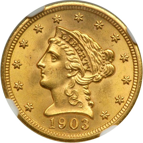 1903 $2.50 Liberty. NGC graded MS-66. An attractive gem, gleaming fresh and lustrous. Pop 278; 88 finer, 2 in 66 Star, 78 in 67, 5 in 67 Star, and 3 in 68 (PCGS # 7855) .