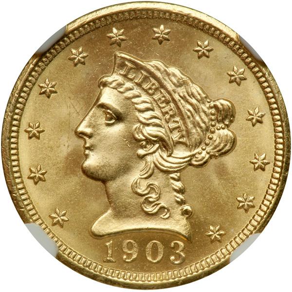 1903. NGC graded MS-68. Boldly struck and untoned. An immaculate gem that is virtually perfect! Yearly mintage figures for the Liberty quarter eagle failed to top 1 million coins from 1862 through the end of the series in 1907. The 1895 (6,119 pieces produced) is generally regarded as the last of the rare dates (although the 1896-1907 issues are scarce to one degree or another in the finer Mint State grades). A resplendent coin, both sides of which show intense luster with a frosty sheen that becomes modest brightness in the fields at direct angles. Bold sharp striking detail is seen throughout, with not a single area revealing an abrasion of note. Will easily eclipse any other coin you put in your set of the finest 19th century gold Type coins. Pop 5; none finer (PCGS # 7855) .