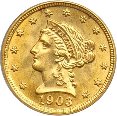 1903 $2.50 Liberty. PCGS graded MS-63. Both sides display subdued golden toning. Sharply struck and lustrous (PCGS # 7855) .