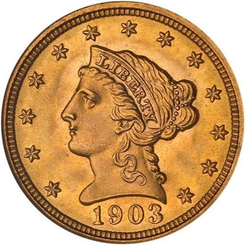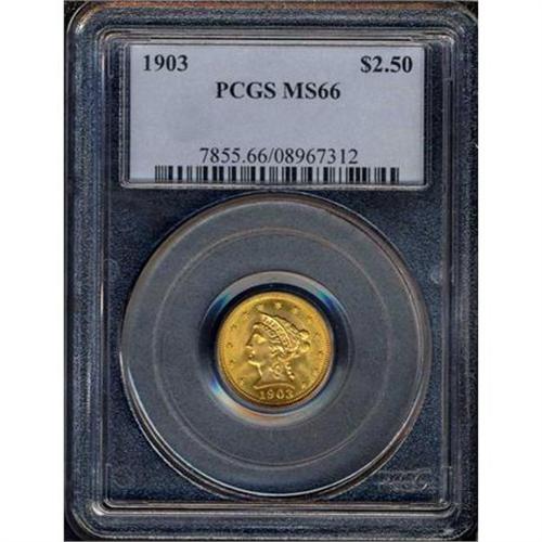<b>1903 $2.50 Liberty. PCGS graded MS66.</b> PCGS Pop: 182. Impressively struck on the obverse, the resounding gold tone resonates to the eye. And just as bold on the reverse, where the eagle's wings and neck feathers show intricate detail. Sleek, satin gold luster throughout <b>(PCGS # 7855)</b> <i>