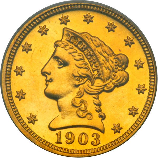 1903. PCGS graded Proof 64. Lovely uniform rich golden toning on both sides. Only 197 Proofs struck. This Choice Proof has bright fire-orange surfaces with mirrored fields and lustrous devices. All of the devices are sharply impressed and the fields have the usual wavy appearance that is typical of Proof coinage from this era. Pop 35; 23 finer (PCGS # 7929) .