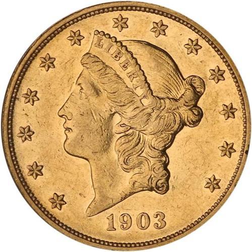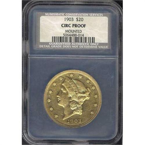 <b>1903 $20 Liberty. NCS graded Circulated Proof. Mounted.</b> Some marks on the face and other handling signs, an impaired Proof at best. But consider this, mintage was only 158 pieces this year for the Proofs! <b>(PCGS # 9119)</b>