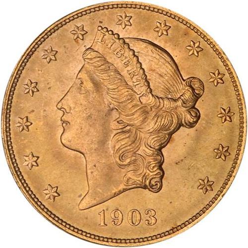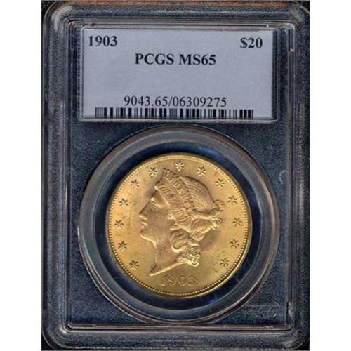 <b>1903 $20 Liberty. PCGS graded MS65.</b> This piece displays attractive deep golden color over the nearly abrasion-free surfaces. Unlike the general sprint of pieces of this gem caliber, the strike is completely convincing in all places, even where some flaw or Achille's heel is usually found at the stars (which tend towards flatness) or the high centers (ditto). A bold Gem, in other words <b>(PCGS # 9043)</b>