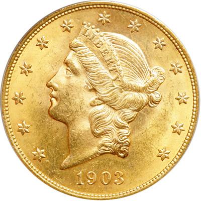 1903 $20 Liberty. PCGS graded MS-63 PQ. Both sides display a touch of light golden to pinkish rose toning. In an old green label holder. What is most noticeable when one first examines this twenty is its swirling mint luster -- it bounces from side-to-side unimpeded by heavy abrasions and unscathed by even a hint of copper spotting (that bane of twenty-dollar gold pieces). A specimen of singular beauty and desirability to the collector (PCGS # 9043).