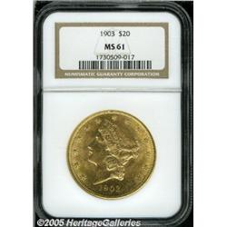 <B>1903 $20 MS61 NGC.</B></I> Shimmering, minimally marked surfaces display significant mint frost and are tinted a uniform light orange-gold color. Very lightly marked, for the assigned grade.