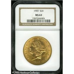 <B>1903 $20 MS63 NGC.</B></I> A well struck Liberty Twenty that offers vivacious cartwheel luster and an especially clean reverse. A lower mintage date. Lot:9320